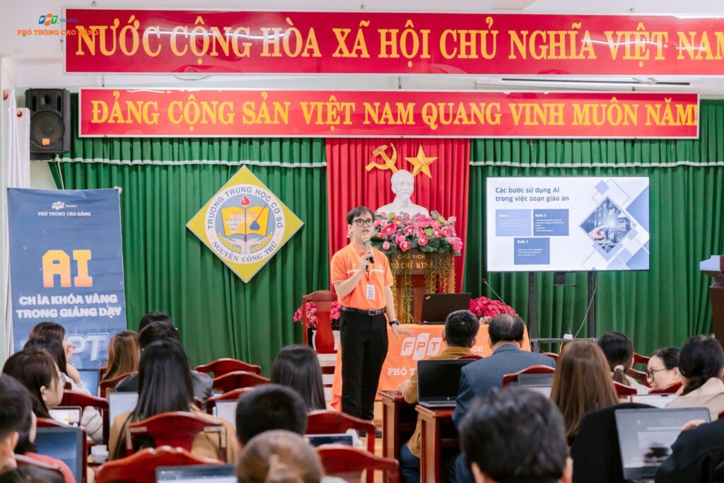 Chương trình tập trung vào những chia sẻ chuyên sâu từ thầy Lê Nhật Quang về sức mạnh của AI trong giáo dục và các tình huống ứng dụng thực tế; Trải nghiệm thực hành sử dụng AI để soạn giáo án nhanh, thiết kế bài giảng hấp dẫn, hỗ trợ quản lý lớp học hiệu quả; Thảo luận và chia sẻ kinh nghiệm, giúp giáo viên không chỉ tiếp nhận kiến thức mới mà còn cùng nhau tìm ra cách áp dụng AI phù hợp với thực tiễn giảng dạy tại trường.