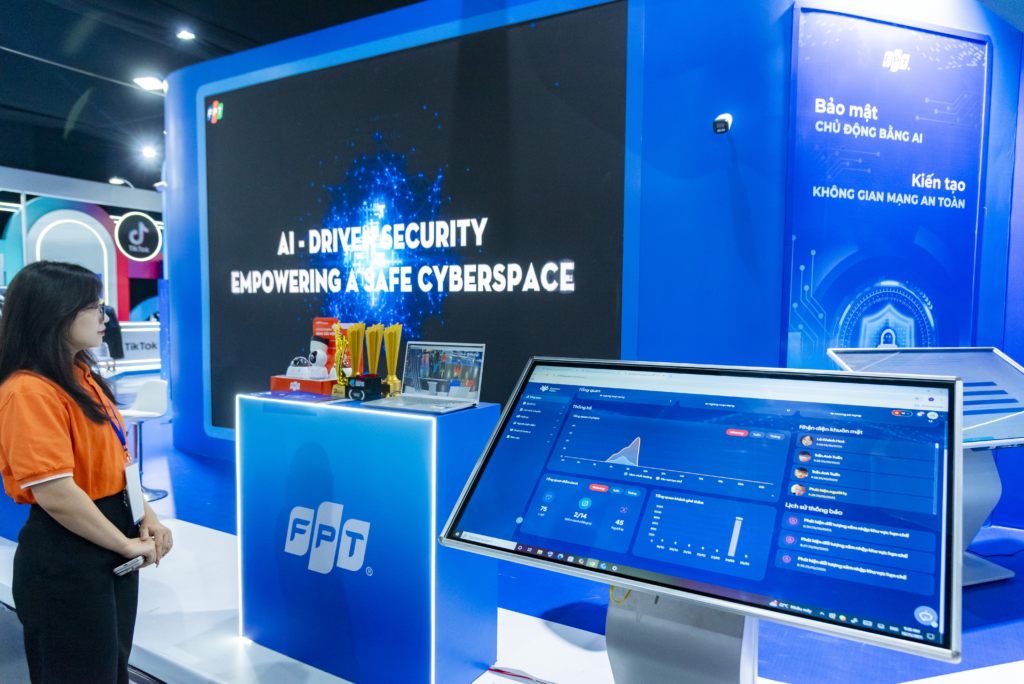 Tại Triển lãm trong khuôn khổ Lễ mở ký Công ước Hà Nội, FPT giới thiệu các giải pháp bảo mật ứng dụng AI đã được giải thưởng tại khu vực, góp phần cùng quốc gia, tổ chức, doanh nghiệp kiến tạo không gian mạng an toàn, tự chủ và bền vững. 08 nền tảng, giải pháp, sản phẩm, dịch vụ tiêu biểu được FPT giới thiệu tại Triển lãm gồm: QaiDora Vision và FPT Camera AI – Nền tảng giám sát an ninh ứng dụng trí tuệ nhân tạo; NightWolf SecureOne - Giải pháp An ninh mạng tinh gọn cho doanh nghiệp hiện đại; Dịch vụ Tư vấn An toàn thông tin; Dịch vụ Đánh giá & Kiểm thử An ninh; Dịch vụ Giám sát & Vận hành An ninh mạng; Dòng chip quản lý nguồn; AI trong chăm sóc sức khoẻ từ xa.