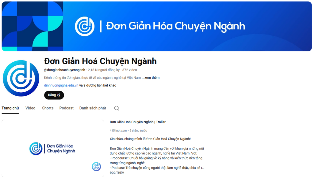 Trên YouTube, kênh Đơn Giản Hóa Chuyện Ngành là điểm nhấn nổi bật của hệ sinh thái. Trong gần tám tháng vận hành, kênh đã đăng tải 375 video, thu về hơn 2 nghìn lượt đăng ký và gần tám trăm ngàn lượt xem. Con số này cho thấy nhu cầu rất lớn của học sinh và phụ huynh đối với những nội dung hướng nghiệp thực tế, dễ hiểu và đáng tin cậy.