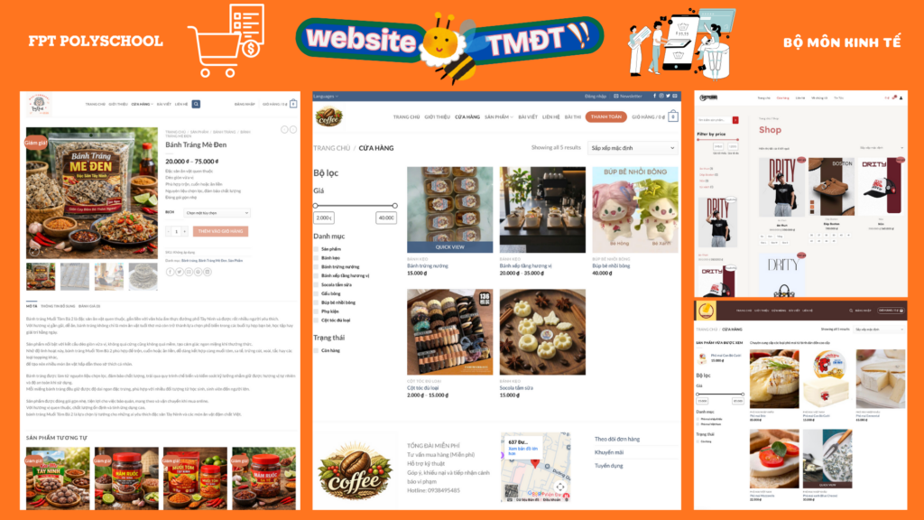 Đặc biệt, trang sản phẩm được sinh viên hoàn thiện đầy đủ các thành phần cần thiết của một website TMĐT, bao gồm: hình ảnh sản phẩm, giá bán, mô tả chi tiết, nút mua hàng/giỏ hàng và các yếu tố hỗ trợ quyết định mua. Các website đều đảm bảo tối thiểu số lượng sản phẩm theo yêu cầu học phần, đồng thời thể hiện sự chỉn chu trong cách trình bày nội dung và hình ảnh.