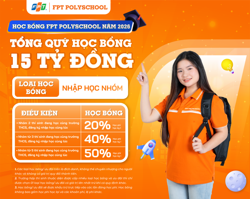 Trong mùa tuyển sinh 2026, bên cạnh Quỹ học bổng 15 tỷ đồng, FPT PolySchool triển khai chương trình ưu đãi nhập học theo nhóm dành cho học sinh đang học cùng trường THCS. Theo đó, thí sinh đăng ký nhập học cùng thời điểm theo nhóm từ 2, 3 đến 5 người có thể nhận ưu đãi từ 20% đến 50% học phí học kỳ 1, vừa góp phần giảm áp lực chi phí, vừa khuyến khích tinh thần đồng hành trong lựa chọn học tập.